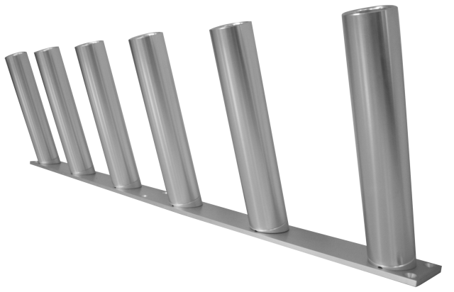Our angled stationary storage rack is built from solid aluminum and anodized to military specs. This unit works great for storing rods and fits well on hardtops. Tubes are threaded and are capable of being screwed on and off for storage purposes; color upgrades to Bright Gold, Blue and Black are available.